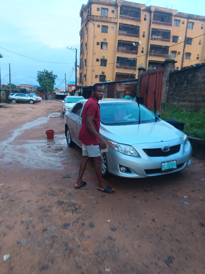 The image portrays an outdoor scene on an unpaved, reddish-brown dirt road in the city of Onitsha, Nigeria, under an overcast sky. The ground displays damp patches and puddles. A young adult male, with dark skin and short dark hair, is walking from left to right in the foreground. He is dressed in a maroon short-sleeved polo shirt, light-colored shorts, and dark slide sandals. He is looking towards the camera and holds a small, light-colored rectangular object in his right hand. To the right of the male subject is a silver Toyota Corolla sedan, positioned with its front facing the viewer's left. Both front windshield wipers are in an upright, raised position. A Nigerian license plate is affixed to the front bumper. A red plastic bucket is on the ground to the left of the vehicle. In the mid-ground, the dirt road continues into the distance, where several other parked vehicles are visible, including a silver SUV and a white sedan. Green foliage and distant buildings are discernible on the horizon. The right background is dominated by a multi-story building (at least five levels) with a yellowish-orange facade, featuring multiple windows, some with security bars, and visible air conditioning units. Adjacent to the road on the right are a corrugated reddish-brown metal fence and a concrete block wall. Utility poles and overhead wires are also present.