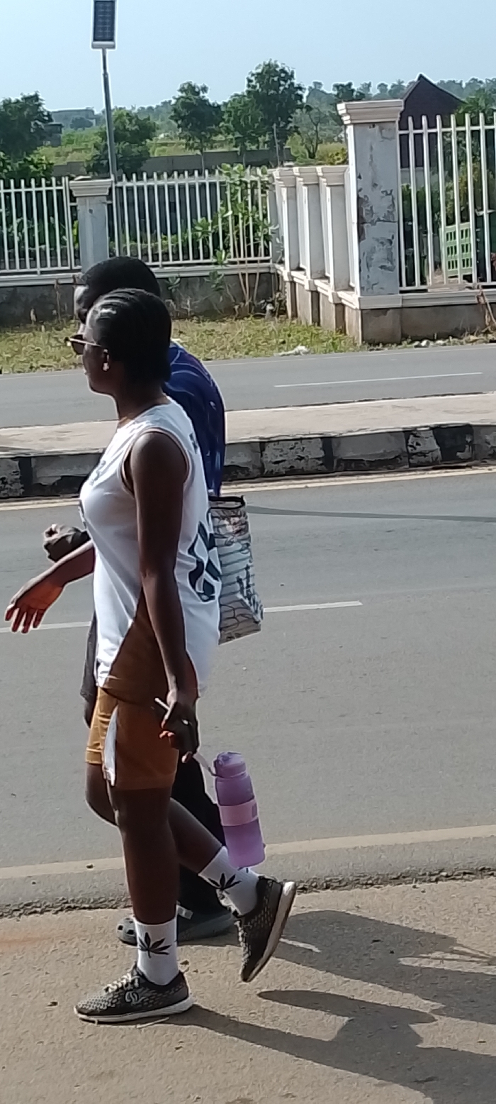Two individuals are depicted walking from left to right along a paved road in Lokoja, Nigeria, under clear, sunny conditions with pronounced shadows. In the foreground, a dark-skinned woman with short dark hair, wearing sunglasses and small earrings, is visible in profile. She wears a white sleeveless top with blue and white accents, tan or brown athletic shorts, white socks with a green cannabis leaf pattern, and dark athletic shoes with white soles. Her right hand holds a light-colored, slender object, possibly a cigarette or pen. A purple water bottle with a light pink strap hangs near her left leg. Behind and slightly to the left of the woman is a dark-skinned man, also in profile. He wears a blue shirt and dark trousers or shorts, and dark shoes. A patterned bag, possibly white and black, is slung over his shoulder, partially visible between him and the woman. To their left is a gray asphalt road with a single white line. A concrete curb, exhibiting wear and dark discoloration, separates the road from a grassy area. Behind the grassy area stands a white metal fence composed of vertical bars and several white concrete pillars, some of which show peeling paint or discoloration. A pole topped with a solar panel is visible behind the fence on the far left. Lush green vegetation and trees are present behind the fence, and a dark-roofed structure is partially visible on the far right, beyond the fence line.