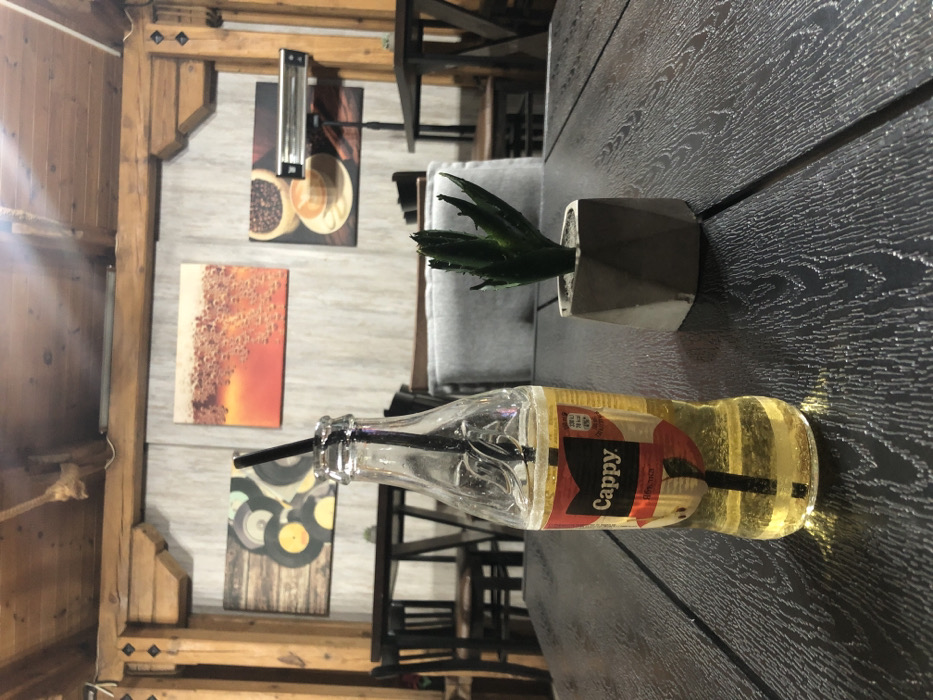The image depicts a static scene within an establishment in Knezha, Bulgaria. In the immediate foreground, centered on the left, is a clear glass bottle containing a light amber liquid, approximately half-full, with a black plastic straw inserted. The bottle's label, predominantly red and black, clearly displays the brand name "Cappy" and the Bulgarian word "Ябълка" (Apple), along with nutritional information "228 kJ / 54 kcal". To the right of the bottle, on the same surface, sits a small artificial green succulent plant in a light gray, faceted geometric pot. Both objects rest on a dark, textured wooden table composed of planks. The background consists of a light-colored, horizontally paneled wall adorned with three framed art prints. From left to right, these prints depict: multiple vinyl records; an abstract image featuring orange and yellow tones with numerous small bubbles, possibly representing beer foam; and a still life composition of coffee beans in a bowl alongside a coffee cup. A silver-colored infrared patio heater, mounted on a dark stand, is positioned in the lower right background, partially obscuring the coffee-themed artwork. Further back, dark wooden tables and chairs are visible, one chair featuring a light gray upholstered cushion, indicating additional seating. The ceiling structure consists of prominent, medium-stained wooden beams. A fluorescent tube light fixture is attached to one of these beams, and a length of rope hangs from the overhead wooden structure in the upper left. The overall lighting suggests an indoor or covered outdoor setting, possibly under artificial illumination.