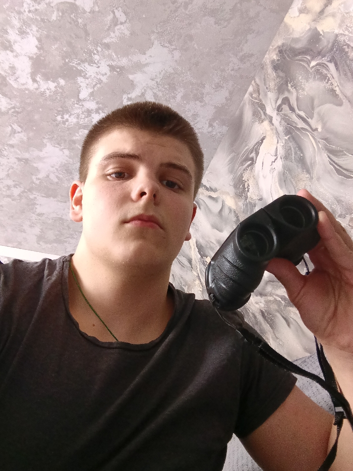 A low-angle, head-and-shoulders portrait of a young male subject in an indoor setting, located in Andreyevo, Russia. The subject, appearing to be in his late teens or early twenties, has a short, light brown buzz cut and maintains a neutral expression while gazing directly at the viewer. He wears a dark grey crew-neck t-shirt with a slightly distressed collar, and a thin green cord is visible around his neck, partially obscured by the shirt. His right hand, positioned in the lower right quadrant, grasps a compact, black pair of binoculars. The binoculars exhibit a textured, rubberized grip and have an attached black strap visible over his shoulder. The background features two distinct indoor wall or ceiling surfaces: a light grey, mottled, somewhat textured surface occupies the upper left, transitioning diagonally to a darker grey, white, and gold-marbled pattern on the upper right.