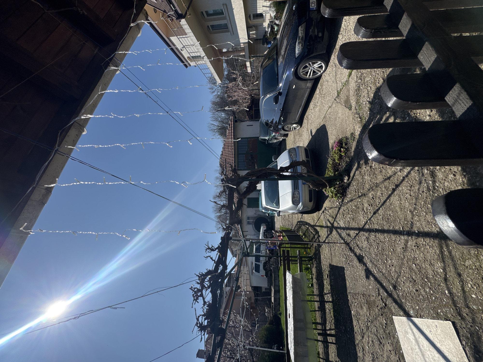 n outdoor scene with several elements. In the foreground, there are wooden structures that appear to be part of a table and benches. Overhead, decorative string lights are strung across the view. Further into the scene, two cars are parked; a dark-colored sedan and a white hatchback. In the background, there are houses and trees. The sky is clear and blue, with a bright light source. Based on the architectural styles and vegetation, the location is likely a residential area in Sofia, Bulgaria. There are no people visible in the image.