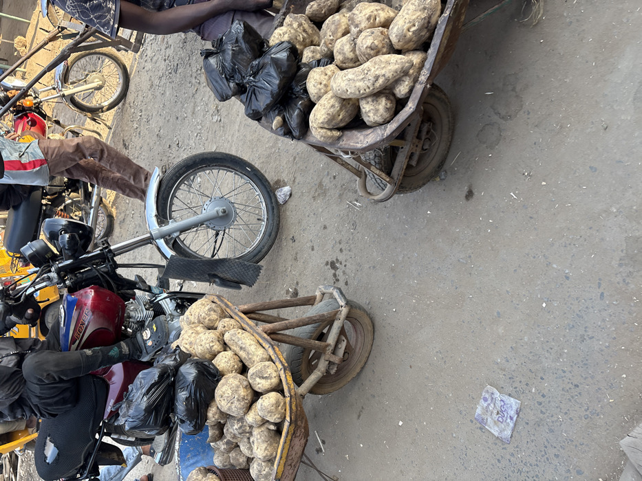 Two wheelbarrows, each laden with potatoes and black plastic bags, sit on a grey surface, likely a street