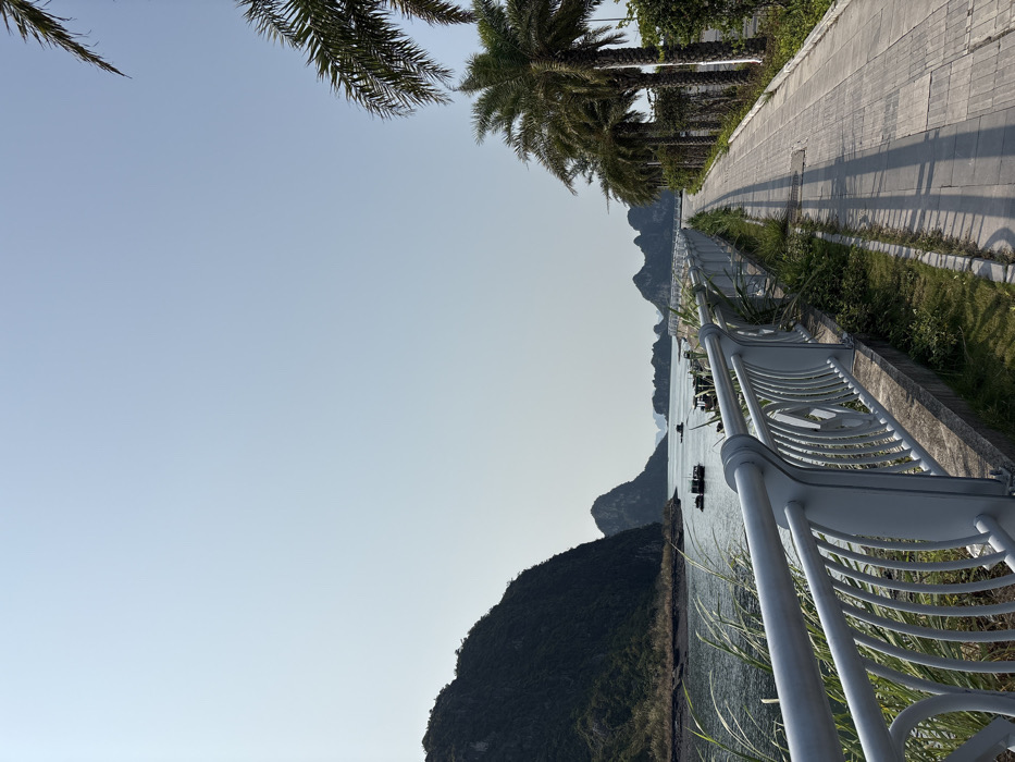 This image displays a coastal scene in Ha Tu Ward, Vietnam, under a clear, hazy light blue sky. A light grey, ornate metal railing extends across the midground, running parallel to the water's edge. To the right of the railing, a paved pedestrian walkway, constructed from light-colored rectangular blocks, stretches into the background. A row of mature palm trees lines the right side of the walkway, casting long, distinct shadows across its surface. Beyond these trees, a paved road segment is partially visible. To the left of the railing, the dark blue-green water of a bay or inlet features several small to medium-sized boats, appearing to be fishing or utility vessels, clustered near the shore. Steep, heavily vegetated karstic limestone mountains rise directly from the water in the left midground and continue into the distant background, forming the distinct geological features characteristic of the region. Sparse green grass and weeds grow in the narrow strip of ground between the railing and the walkway, as well as along the base of the mountains. No individuals, animals, or explicit actions are observed within the frame.