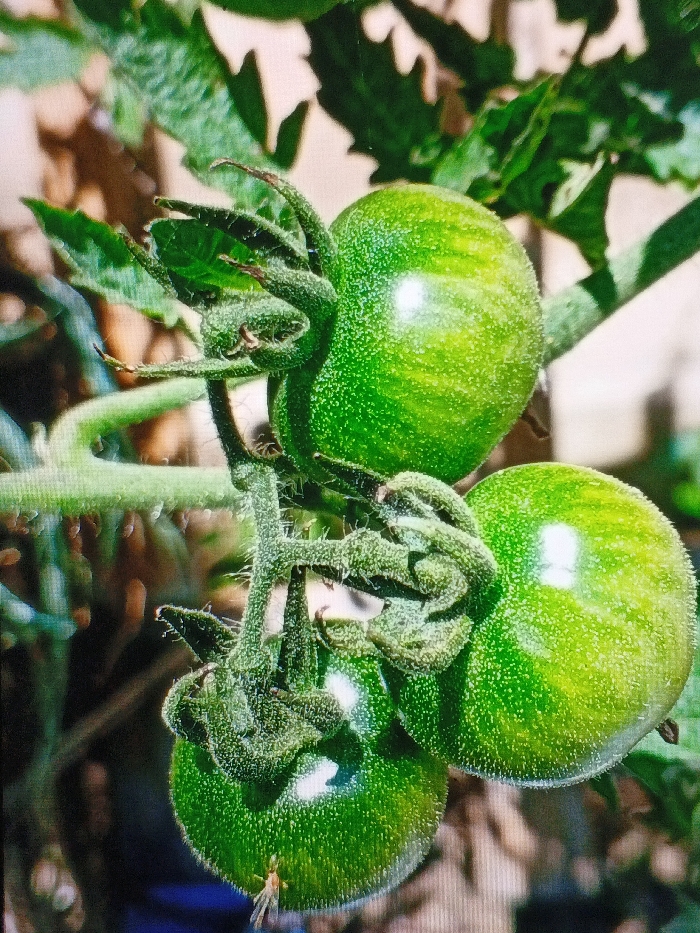 Three green tomatoes are clustered together on a vine, unripe. The tomatoes are round and glossy, with faint stripes. Fuzzy green sepals curl around where the tomatoes connect to the stem. The stem and sepals are covered in small hairs. Green tomato leaves are visible in the background, and the rest is slightly blurred.