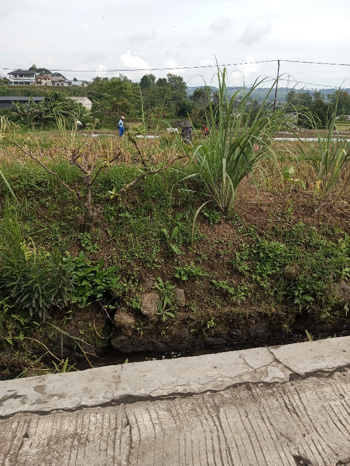 The image depicts an agricultural scene in Kandenuwara, Sri Lanka, under an overcast sky. The foreground features a grey concrete surface, likely a pathway or road, exhibiting parallel grooves and a horizontal crack. Immediately beyond this, a narrow, dark, water-filled ditch runs parallel to the concrete. An earthen embankment rises behind the ditch, covered with various grasses, weeds, and small plants, including a prominent clump of tall, light-green grass-like plants on the right, and a bare, multi-branched shrub to the left. Small rocks are visible on the embankment. In the mid-ground, a cultivated field extends horizontally, appearing to be a rice paddy with sections of stubble and standing water. Two individuals are present in this field, engaged in agricultural activity. The first person, on the left, wears a blue shirt and light-colored trousers, standing upright. The second person, further right, wears dark clothing and a wide-brimmed hat, positioned in a bent or hunched posture, indicative of manual labor. The background shows additional green vegetation and several residential or utility structures. Distant hills covered in dense trees form the horizon line. Overhead utility lines are visible spanning across the upper mid-ground.