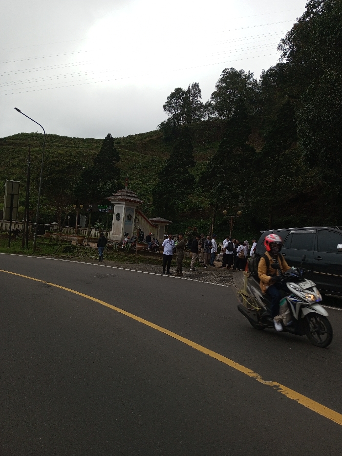 The image depicts a roadside scene, identified as being in the city of Boommlog, Bhutan, under an overcast sky. In the foreground, a dark asphalt road with a solid yellow dividing line extends from the bottom left to the mid-right. A white and blue Honda Vario-style scooter, equipped with transparent side fairings, travels leftward. The rider wears a yellow jacket, blue jeans, and an orange full-face helmet with a dark visor. In the midground, to the right of the road, a group of approximately 15 to 20 individuals is gathered on a paved shoulder adjacent to a decorative monument structure. Many in the group wear white shirts, while others are in darker attire. Two individuals, one in a light blue shirt and dark trousers, and another in what appears to be a camouflage top and khaki trousers, are prominent within the group, possibly indicating official roles. Several people are seated on a low wall or bench near the monument. A dark SUV is partially visible parked on the far right, behind the group. The monument is a light-colored, ornate structure with a multi-tiered roof and a finial, featuring a dark sign with white text that reads "SELAMAT DATANG" (Indonesian/Malay for "Welcome"). Surrounding the monument area are scattered green shrubs and additional streetlights. In the background, the terrain consists of densely vegetated green hills or mountains rising sharply. Tall trees line the upper slopes. A streetlamp pole and overhead power lines are visible on the left side of the frame.