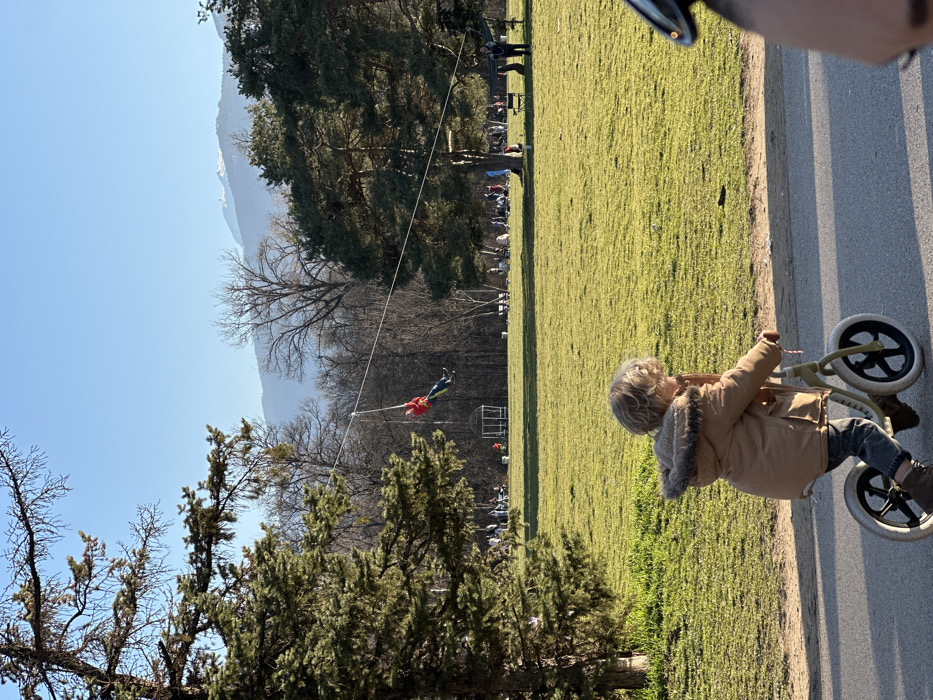 The image depicts an outdoor park scene on a clear, sunny day in Sofia, Bulgaria, likely within Borisova Gradina (Boris' Garden), with Vitosha Mountain visible in the background. In the foreground, a young child with light, curly hair, wearing a brown winter coat with a fur-lined hood, dark pants, and brown boots, rides a light-colored balance bike on an asphalt path that traverses the bottom left of the frame. Part of an adult's head is visible on the far right. The midground features a large, sunlit grassy field. To the left, tall evergreen trees stand, with some bare deciduous branches overhead. Across the field, a person wearing a red top and dark pants is actively riding a zip-line, suspended from a rope and pulley system stretched diagonally across the upper midground. Several groups of people are scattered across the grass in the distance, some appearing to relax on blankets. A white, open-sided gazebo structure is visible further back within a wooded area. The background consists of a clear, bright blue sky above a distant, snow-capped mountain range, characteristic of Vitosha Mountain, appearing somewhat hazy due to atmospheric distance. The general environment suggests a recreational park area during late winter or early spring.