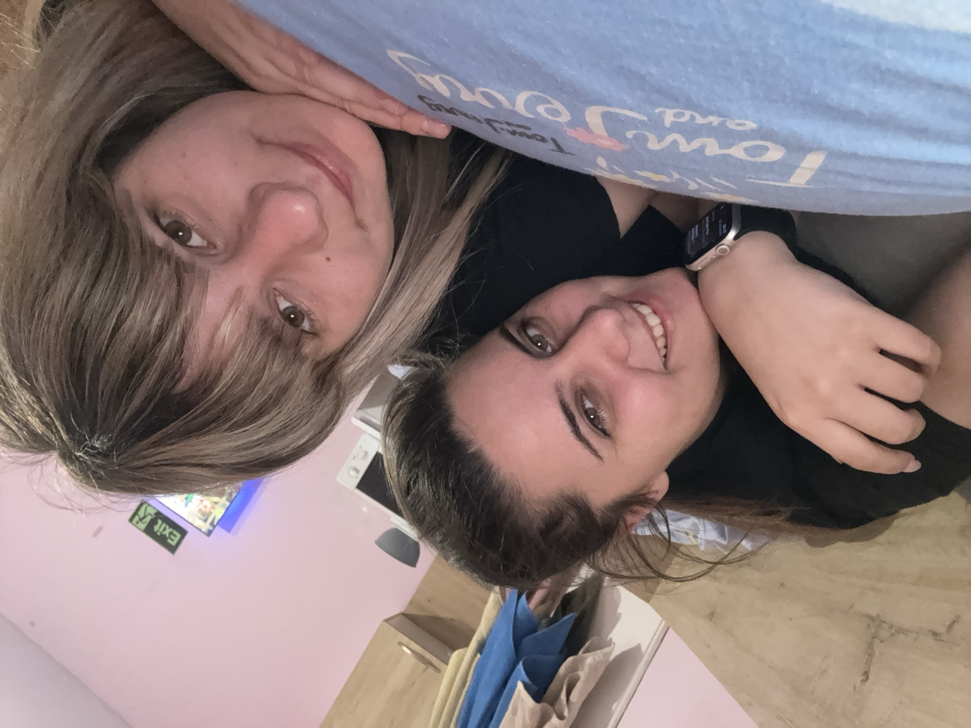 Two women are closely positioned and looking at the camera. One woman has blonde hair with bangs, while the other has dark hair pulled back. The woman with blonde hair is slightly above the other in the frame. A light blue shirt with writing is partially visible above the blonde-haired woman. The woman with dark hair wears a black shirt and a smartwatch on her wrist. Behind them, a room with pink walls and wooden flooring is visible. A small "Exit" sign is on the wall, and a partially visible piece of furniture with blue and light-colored clothing is present. Based on the "Exit" sign in Bulgarian Cyrillic, the location is likely in Bulgaria, but further location details (such as Sofia) cannot be confirmed from the image.
