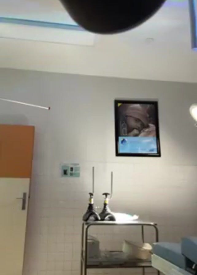 n operating room. A woman in light-colored scrubs approaches a stainless steel cart with medical equipment on it. Behind the cart is a white tiled wall with a framed picture. The room is brightly lit, with surgical lighting visible from the ceiling. There is a partially visible orange-colored cabinet on the left and an operating table on the right.