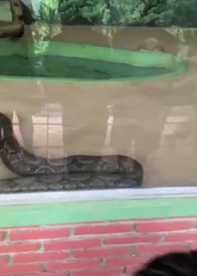 large snake in an enclosure behind glass. The snake is dark brown with a pattern of lighter brown spots. It is coiled up on the sand in the enclosure. There is a green shallow water area in the background of the enclosure. Outside the enclosure, people are standing and looking at the snake. The enclosure is surrounded by a red brick wall. Beyond the enclosure, there is a forest area.