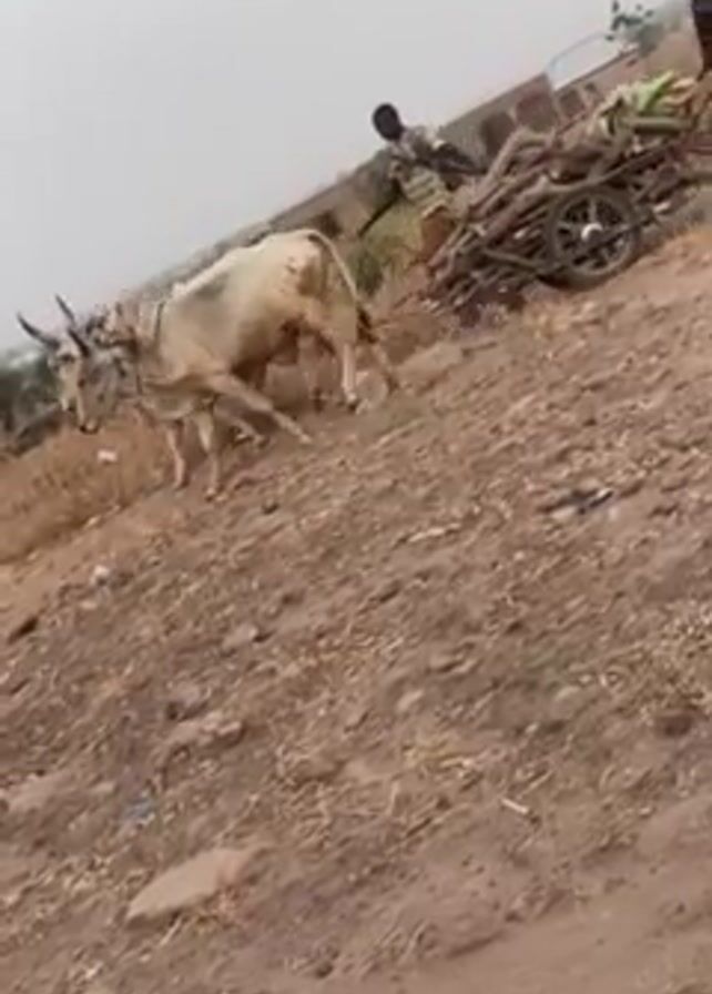 two light-skinned oxen pulling a wooden cart loaded with logs uphill on a dirt path. Two dark-skinned people are helping to push the cart from behind. The background is a hazy landscape with sparse vegetation.