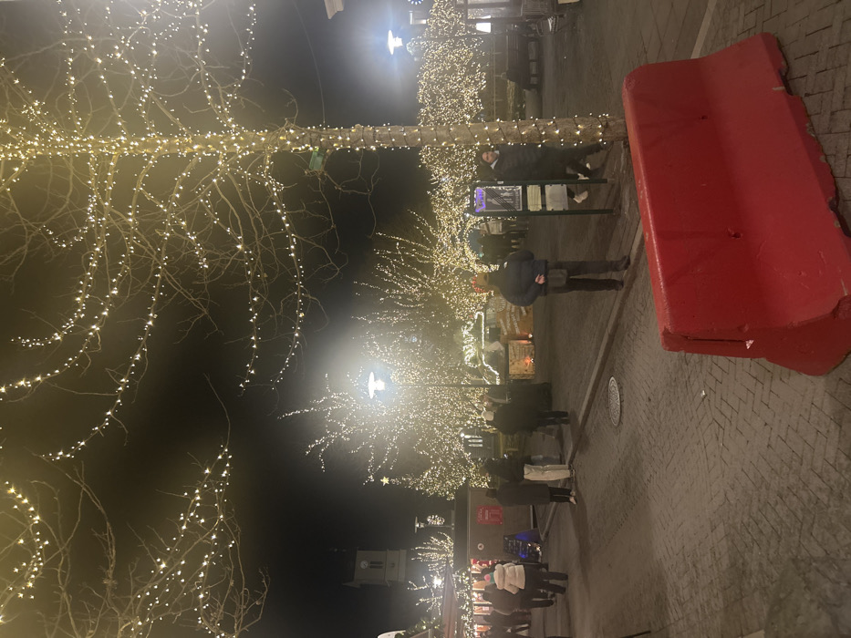 A nighttime street scene shows bare-branched trees heavily decorated with small, warm white lights. A cluster of people is visible near the bottom of the frame, suggesting a gathering or market. A red concrete barrier sits prominently on the right side of the frame. The area is paved with patterned bricks. In the background, a taller building with a steeple is partially illuminated.