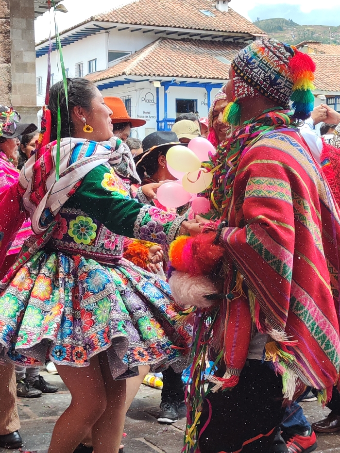 Two traditionally-dressed dancers in a brightly-colored street scene. A woman in a floral dress with a green bodice and colorful shawl faces a man in a red and patterned poncho, also wearing a decorative hat with rainbow tassels. They appear to be celebrating, as evidenced by confetti and small pink balloons. A building is visible in the background with a red-tiled roof and a sign reading "Plaza."