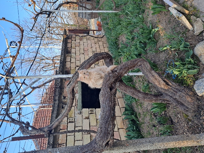 This image depicts an outdoor scene in Spanchevtsi, Bulgaria, under clear daylight conditions. A fluffy, light orange-cream colored domestic cat is centrally positioned, seated upright on a thick, gnarled vine or tree branch. The cat faces forward, looking directly at the viewer. The vine, with its dark, woody bark, forms a complex structure, extending upwards and to the right, supported by metal poles and wires against a blue sky. Behind the cat, a single-story brick structure, constructed from light-toned bricks, features a dark, rectangular opening. To the far left, a portion of a building with a terracotta tiled roof is visible above the brick structure. The ground beneath the vine and cat is predominantly brown soil, with numerous clusters of young green plant shoots emerging. In the far right background, two weathered wooden barrels stand upright, positioned near additional brickwork. Leafless deciduous trees are visible in the distant background. The scene exhibits natural lighting.