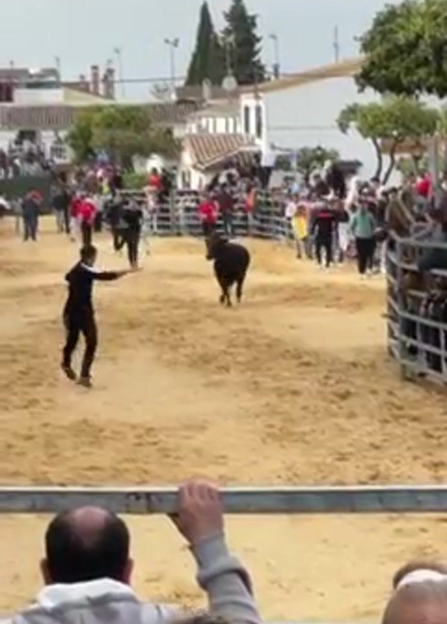 bull run in a sandy arena surrounded by spectators. A young black bull is running around inside the enclosure. There are people inside of the arena with the bull, running from it and trying to get its attention. The arena is enclosed by a metal fence that spectators are leaning against. In the background, there are white buildings and trees. The weather looks to be cloudy.