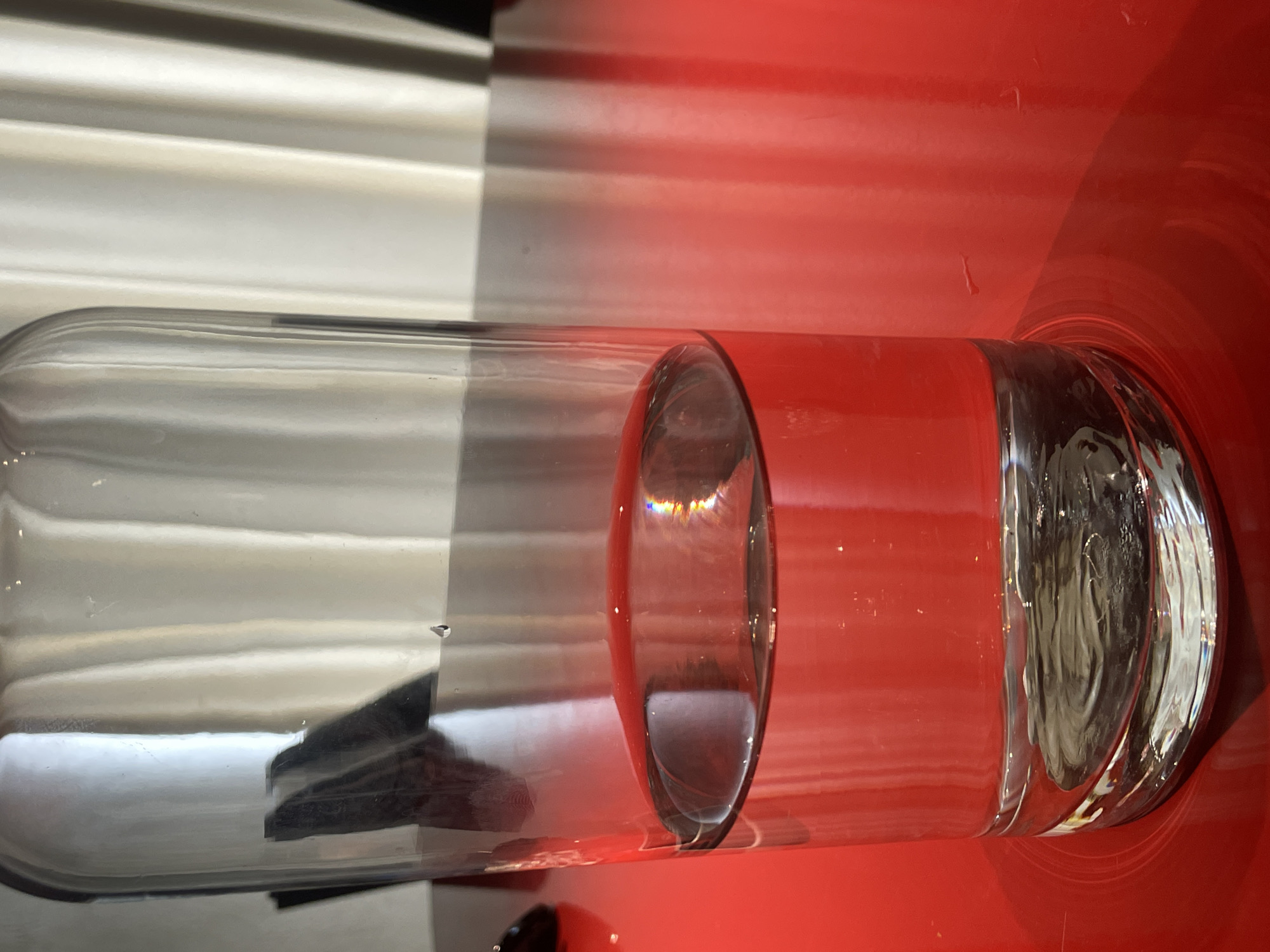 A clear glass, approximately half full with water, is horizontally oriented on a bright red surface