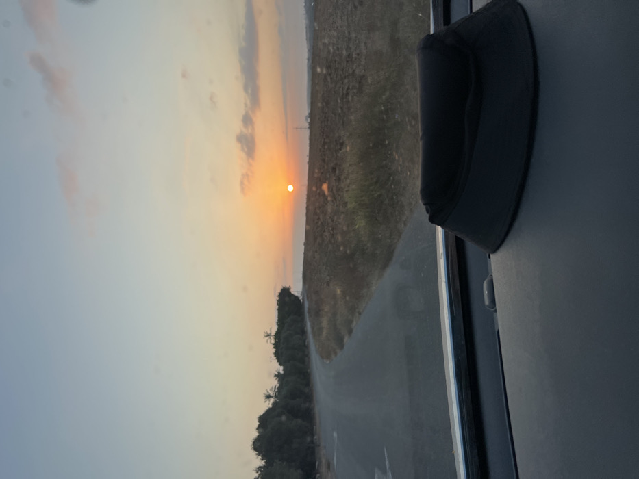 The image depicts a rural landscape at sunset, viewed from the interior of a vehicle, located near Ga'ash, Israel. The bright, circular orange sun is positioned low on the horizon, dominating the central-right portion of the frame. The sky transitions from a vibrant orange and yellow at the horizon to a pale blue overhead, with minimal, wispy clouds. An asphalt road, devoid of markings, curves gently to the left and recedes into the distance. To the left of the road, a dense line of trees, including several tall palm trees, forms a dark green border. To the right, a wide, open field with dry, sparse vegetation and exposed patches of dark soil extends to the horizon, where indistinct structures are faintly visible. The lower foreground of the image shows the dark gray dashboard of a vehicle, with a black fabric sun visor resting on its right side. No individuals are visible.
