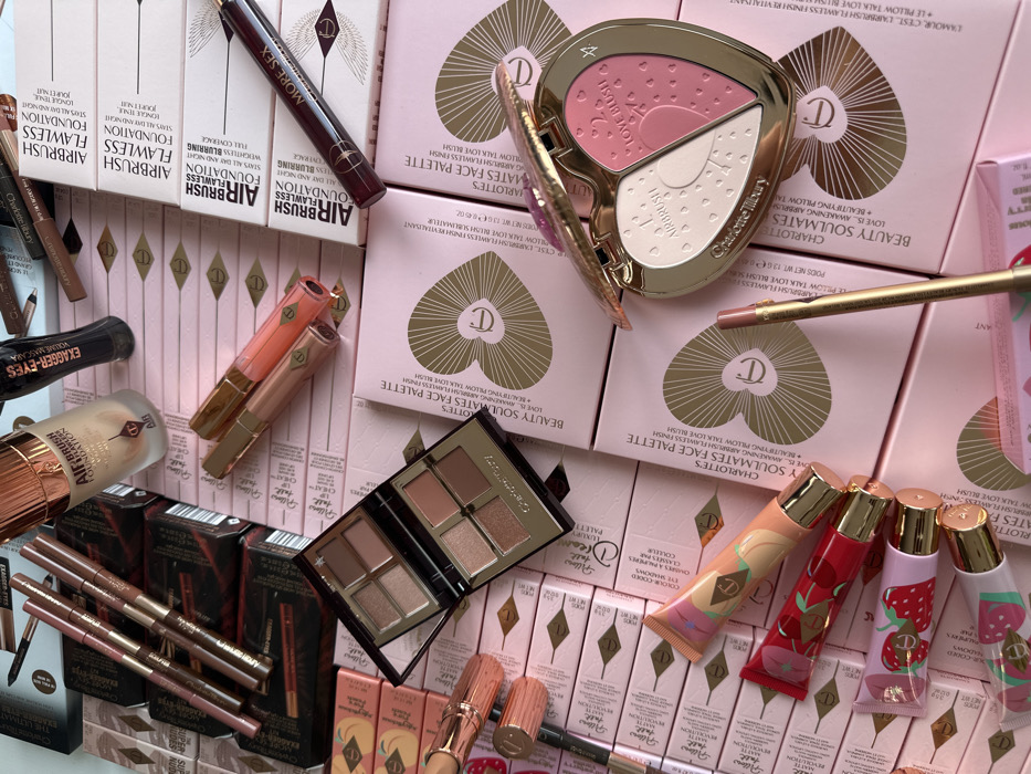 The scene is an overhead view of a dense arrangement of Charlotte Tilbury cosmetic products laid out on a light-colored, flat surface in Sofia, Bulgaria