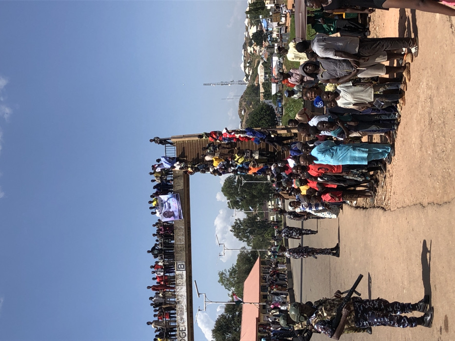 The image depicts a crowded urban scene in Jos, Nigeria, at ground level and on a concrete pedestrian overhead bridge, labeled "BRIDGE B". The sky is clear blue. On the bridge structure and its access stairs, numerous civilians, predominantly adult males, are gathered, most facing towards the right side of the frame. A large banner, primarily blue and white with visible text including "GOOD GOVERNANCE" and a photograph of an individual, hangs from the bridge. At ground level, an unpaved reddish-brown shoulder parallels a paved road. Along this shoulder, a long line of civilians, comprising men, women, and children of various ages, stands observing an event or procession occurring off-camera to the right or moving from left to right. In the foreground, a uniformed security officer in camouflage (blue, grey, black pattern) fatigues, a tactical vest, helmet, and dark boots stands holding an assault rifle (appearing to be an AK-pattern) with an extended magazine, positioned downwards and slightly forward. Another uniformed officer in similar attire is visible further back on the paved road, and additional indistinct uniformed personnel are present further down the road to the left. The officers appear to be maintaining order or providing security for the gathering. In the mid-ground and background, streetlights with solar panels are visible along the road. Beyond the road on the left, several buildings, including one with a red roof, are visible. Hilly terrain with residential structures and a tall communication tower are present in the distant background.
