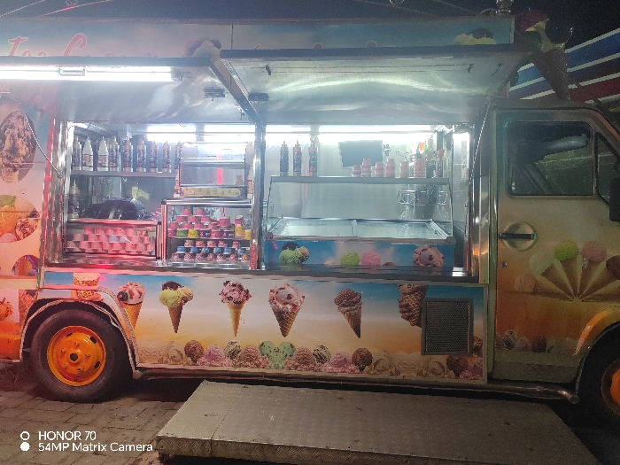 An ice cream truck is captured at night. The vehicle’s design prominently features colorful cones and ice cream scoops painted on its exterior. Inside, shelves display a variety of toppings and neatly arranged cups of ice cream. Its lights are on, illuminating the interior and drawing attention to the array of frozen treats. The truck is parked, and the surroundings are dimly lit.