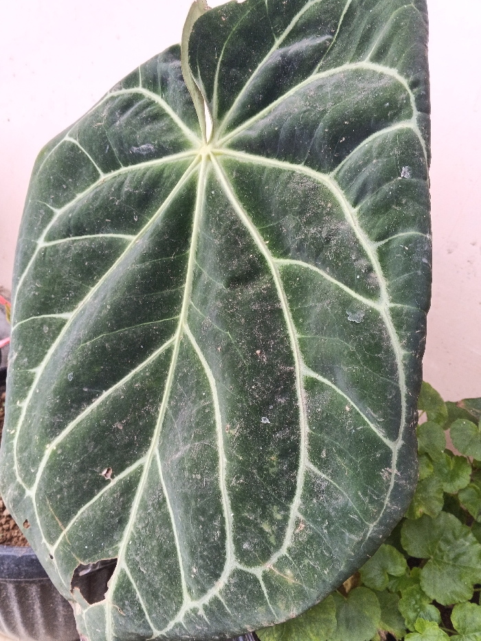A large, textured Anthurium leaf dominates the frame