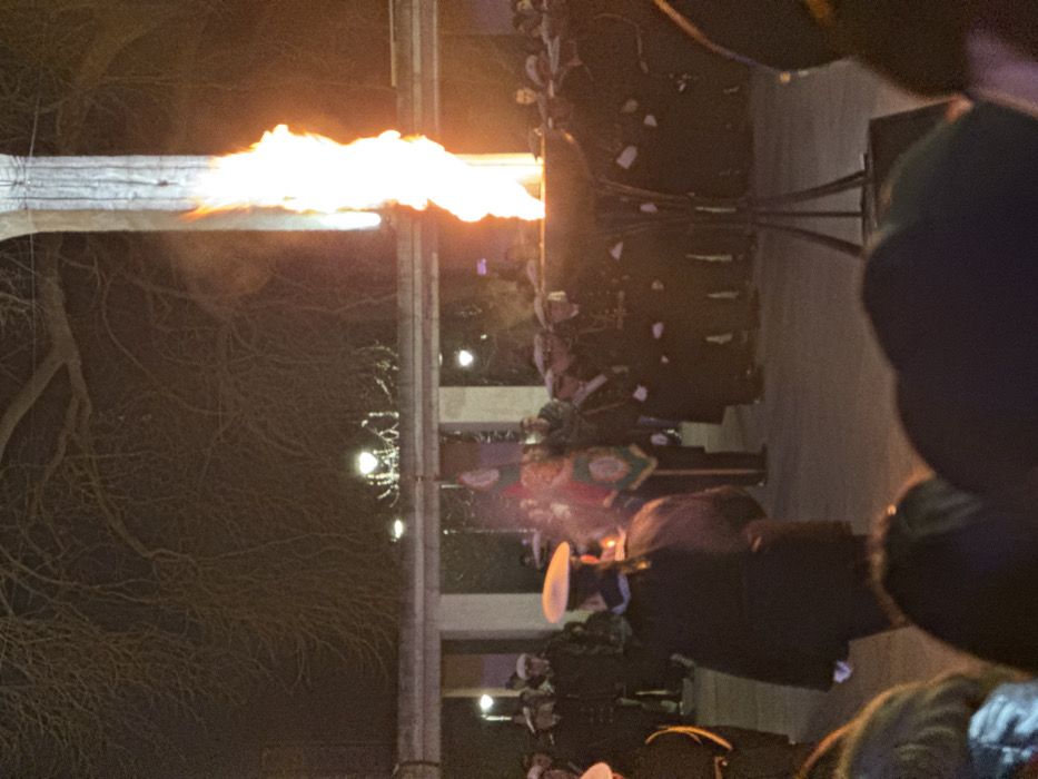 At night, an outdoor formal event is underway at the Warriors' Pantheon (Panteon na boretsite) in Varna, Bulgaria. A large, bright orange and yellow flame erupts from a dark metal cauldron supported by a tripod stand, centrally located to the right. Numerous individuals in dark military-style uniforms with white-topped peaked caps are present. One uniformed person, viewed from behind, walks towards the right-midground. To their right and surrounding the flame, other uniformed personnel stand in formation. A person holds a green ceremonial banner with a circular emblem in the center-midground. In the background, a light-colored stone structure with archways is visible, with bare tree branches silhouetted against the dark sky above. Streetlights illuminate parts of the scene. The foreground shows the heads of partially obscured spectators. The ground is a paved surface.