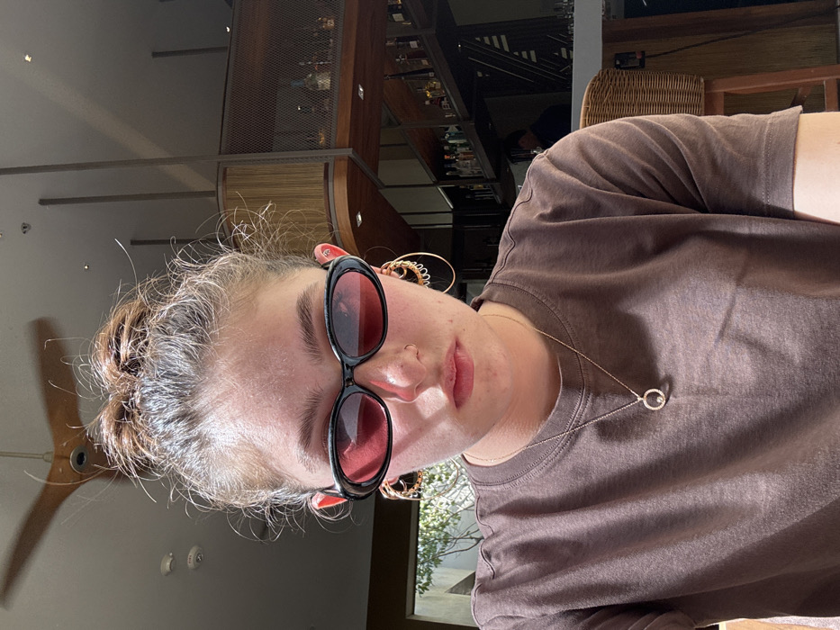 A person with their hair pulled back, wearing black-framed sunglasses with red lenses, faces the camera. They wear a brown t-shirt and a delicate necklace with a circular pendant. Large, gold hoop earrings adorn their ears, and a small nose piercing is visible. The background suggests an indoor setting with a bar or restaurant area, a ceiling fan, and natural light filtering through a window.