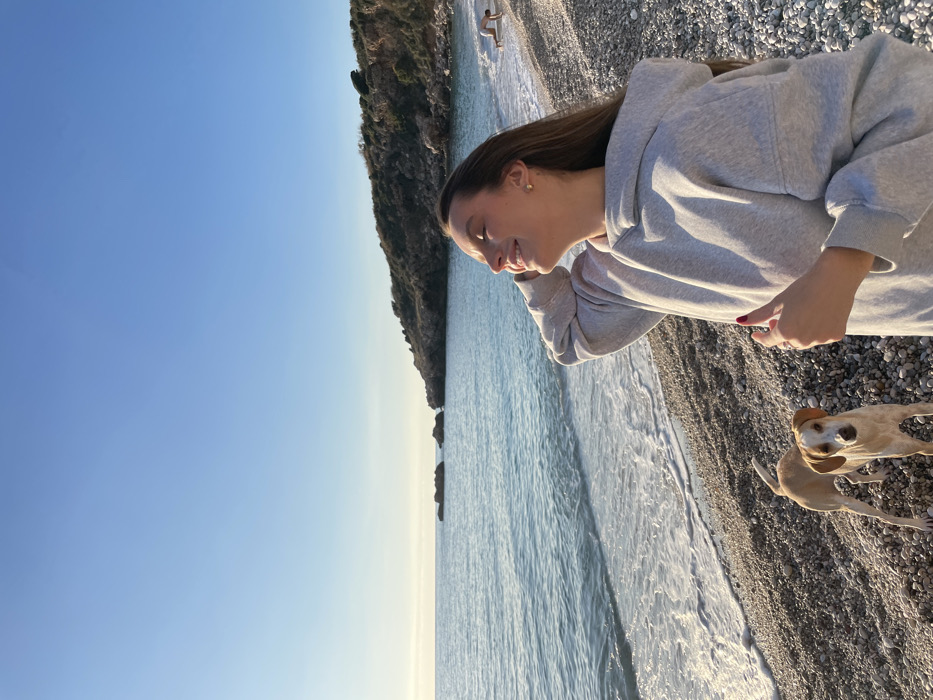 The image displays a coastal scene in Drobnići, Montenegro. In the foreground, a light-skinned female with long, brown hair wears a grey hooded sweatshirt and a gold earring. She is positioned facing right, eyes closed, with a smile, and her right hand is raised towards the back of her head, while her left hand with red nail polish is visible. To her left, a short-haired dog, light brown and white with patches, stands on the pebble beach, looking towards the viewer. The beach is composed of small, grey and white pebbles. The sea, exhibiting calm, light blue-green water, features small waves breaking at the shoreline. In the mid-ground, a rocky, vegetated coastline curves around a bay, with two distinct rock formations visible in the water. The sky is clear and light blue. In the far right background, a person in light-colored clothing is observed on their hands and knees at the water's edge. The scene is illuminated by natural sunlight, indicating a clear day with a low sun angle.