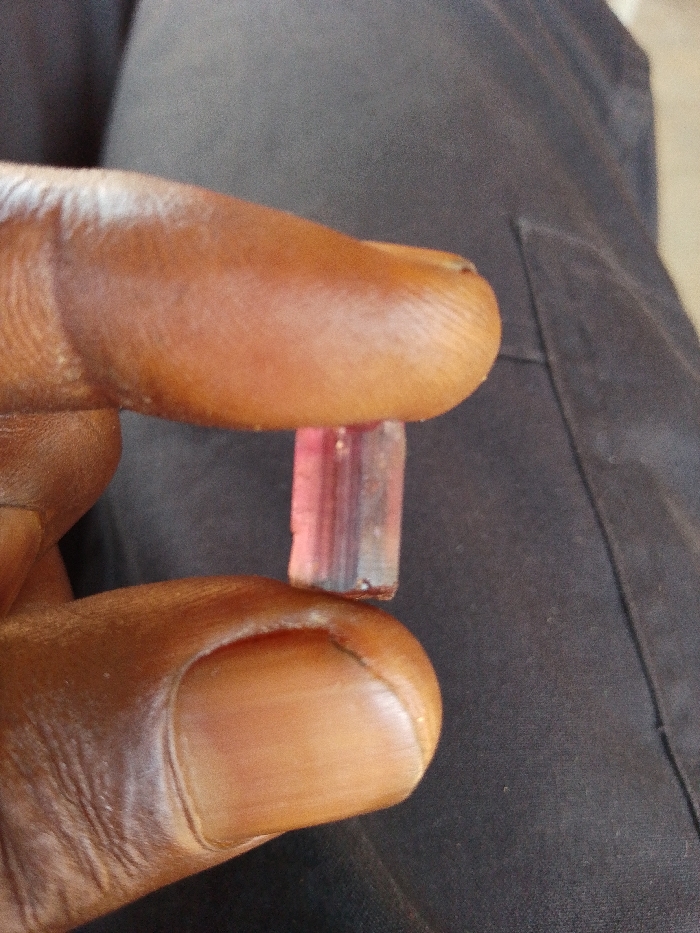 - "An overhead, close-up photograph captures two dark-skinned fingers holding a single, elongated, prismatic mineral specimen against a dark, indistinct fabric background" by FM-kquCH2, licensed under CC BY 4.0