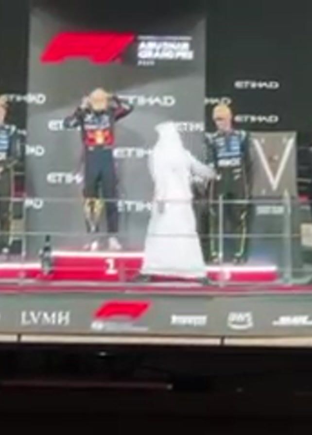 Here's a detailed description of the video: The video shows a Formula 1 podium ceremony. Three drivers stand on the podium. The driver in the center, wearing a Red Bull racing suit, is being handed a trophy by a person in traditional Arab clothing. To the left and right of the central driver, the second and third place drivers stand in their racing suits. Several other individuals stand on the podium as well, including a woman in a business suit and several men in Arab garb. The backdrop features the Formula 1 Abu Dhabi Grand Prix 2023 logo, along with "Etihad" displayed prominently. Sponsor logos, like Qatar Airways, Aramco, LVMH, Pirelli, AWS, and DHL, are visible at the base of the podium. People are taking pictures of the ceremony. The footage is taken from a screen, likely a TV, within an indoor environment.