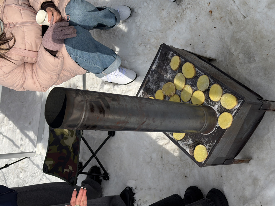 An outdoor scene in Tsovazard, Armenia, displays a snow-covered ground under bright daylight. Centrally positioned is a dark, rectangular metal stove with a tall, cylindrical chimney pipe extending vertically. The stove's top surface holds approximately twenty-three thin, circular, yellow slices, consistent with cut potatoes, arranged around the chimney base and across the surface. White residue, possibly salt or flour, is visible on the stove's top. To the left, the lower body of an individual is partially visible, clad in dark pants and black shoes/boots. A left hand, adorned with a ring on the fourth finger, extends into the frame, positioned above the snow. Behind the stove and to the left, a camouflage-patterned foldable camping stool is partially visible. To the right, a person is seated, wearing a light pink puffy jacket, blue jeans with rolled-up cuffs, and white athletic shoes with black soles. This individual's left hand, covered by a light pink fuzzy glove, holds a white cup. The right hand also appears gloved. The overall interaction suggests people gathered around the stove for warmth or cooking.