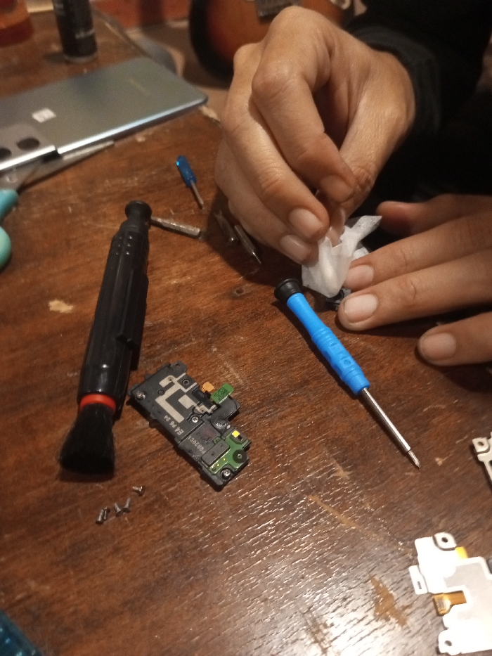 A close-up, high-angle image depicts an electronic repair operation on a wooden surface. The specific location, Bagochen Boolingpang Ueling, Bhutan, is not visually identifiable; the scene appears to be an indoor workspace. One individual's hands, exhibiting light to medium skin tone, are centrally positioned. The left hand, partially covered by a dark sleeve, holds a small piece of crumpled white tissue or cloth, which is positioned over a small black electronic component being manipulated by the partially visible right hand. The hands demonstrate careful engagement with the small components. The wooden surface, characterized by a visible grain and minor wear, contains several objects: - A black circuit board assembly, approximately 5 cm in length, marked "E4 P4 24" and "7D82C01", with green and silver elements, rests centrally. - Four small metallic screws are grouped near the bottom left of this circuit board. - A partially visible white electronic component with orange flexible connectors is present on the bottom right. - A black-handled screwdriver, approximately 15 cm long, with a red ring and a brush attachment at its base, is oriented horizontally on the left side. - A blue-handled precision screwdriver with a silver tip is positioned diagonally, pointing towards the lower right quadrant. - Several additional small screwdriver bits or individual tools are scattered in the upper central area. - In the upper left background, a silver smartphone with a partially separated rear casing is visible, indicating the object of repair. - A small blue prying tool is partially visible on the far left edge of the frame. The background is out of focus, revealing a dark, curved object, possibly part of a musical instrument, and a black cylindrical item. Ambient indoor lighting illuminates the scene. The arrangement of tools and components signifies a focused and precise task involving the disassembly or repair of an electronic device.