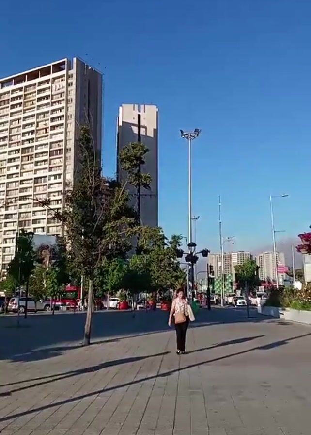 sunny urban scene. Two women walk along a paved, brick-patterned sidewalk in the foreground. A tall apartment building and another high-rise structure stand behind them, along with streetlights, trees, and other buildings in the distance. The sky is clear and blue. Several cars can be seen in the street beyond the sidewalk. The overall atmosphere is bright and calm.