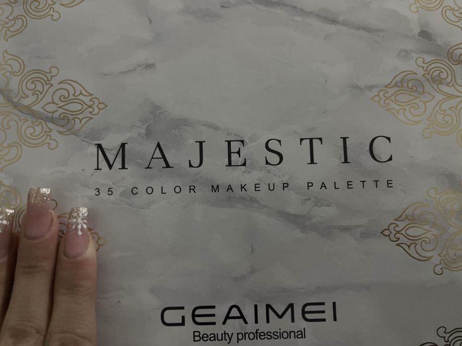 A makeup palette with the word "MAJESTIC" in black, large font at the top. Below it, "35 COLOR MAKEUP PALETTE" is printed in a smaller font. The brand name "GEAIMEI" is in a larger, bolder black font at the bottom, with "Beauty professional" printed beneath it. The background has a marble-like pattern with ornate gold decorations on the corners. A hand with glittery nails and snowflake designs is on the left side of the palette.