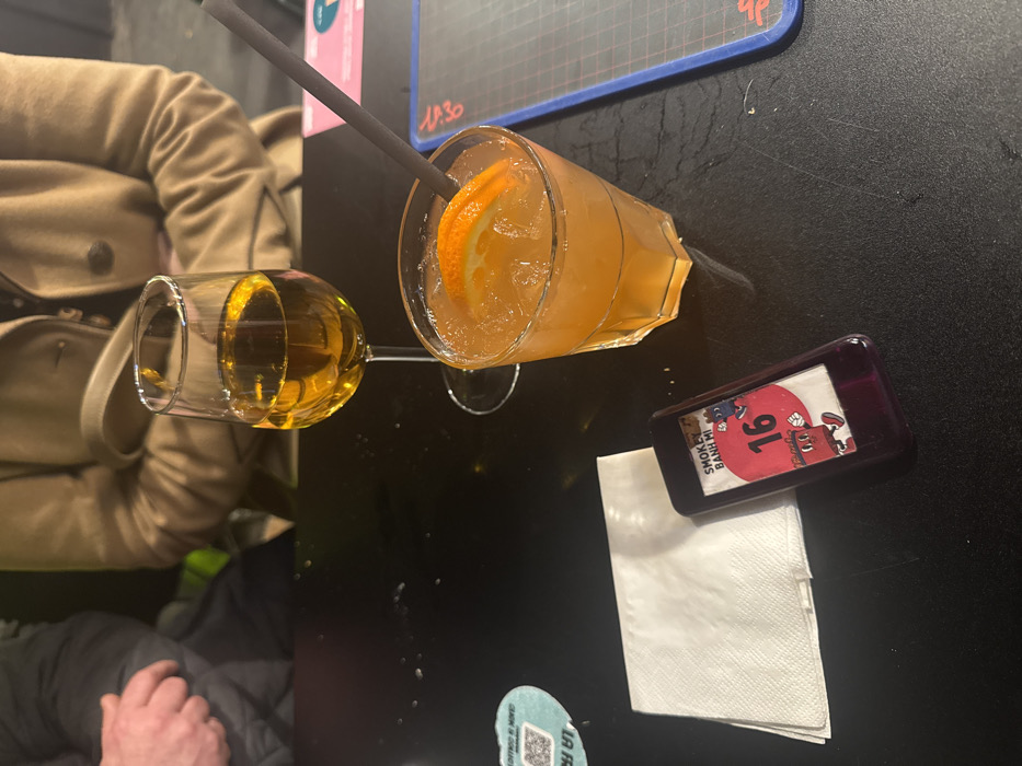The image depicts a close-up, high-angle view of a dark, slightly reflective table surface in Saint-André-lez-Lille, France, likely within a restaurant or bar setting. In the foreground, a white, folded paper napkin rests to the left of a dark purple or black rectangular electronic device. This device displays a graphic featuring a red circle with the white number "16", the text "SMOKEY BANH MI" above it, and two cartoon characters, one red and one blue. To the right of these items, a faceted glass tumbler contains an orange-colored beverage with ice cubes and an orange slice garnish, penetrated by a dark-colored straw. Further to the right and slightly behind, a clear stemmed wine glass holds a light amber liquid. In the blurry background, two individuals are partially visible: one on the left with a dark sleeve and hand, and another in the center-right wearing a light brown buttoned coat. A light blue circular coaster with a QR code is partially visible on the far left, and a blue rectangular placemat with a grid pattern and red text is on the far right. The table shows minor smudges or spills. No specific actions or interactions are discernible.