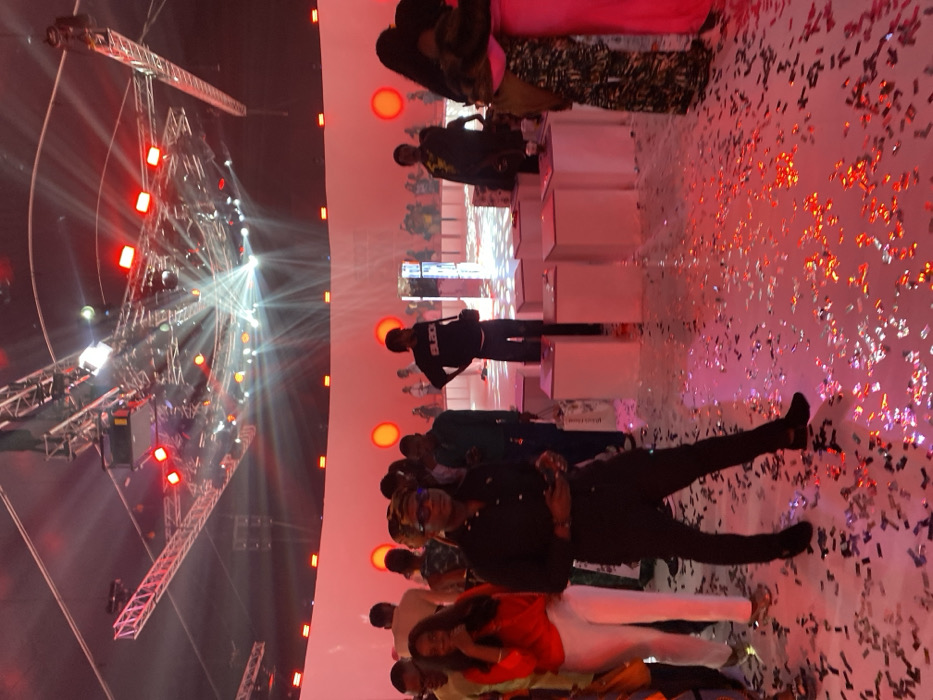 The image portrays an indoor event space in Itirin, Nigeria, characterized by a red and white lighting scheme