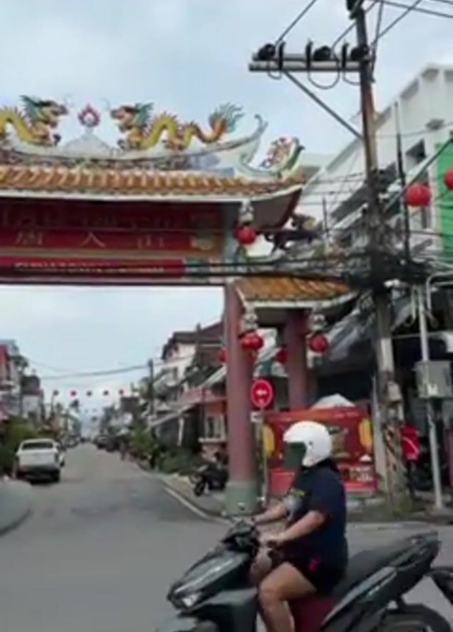 A person riding on a red scooter, possibly a moped, passes under an ornate Chinese gateway. The gateway features dragons and Chinese script and is decorated with red lanterns. The road leading through the gateway is lined with buildings. A white truck is driving in the distance. Power lines and utility poles are visible above. A sign prohibiting a left turn is also visible.