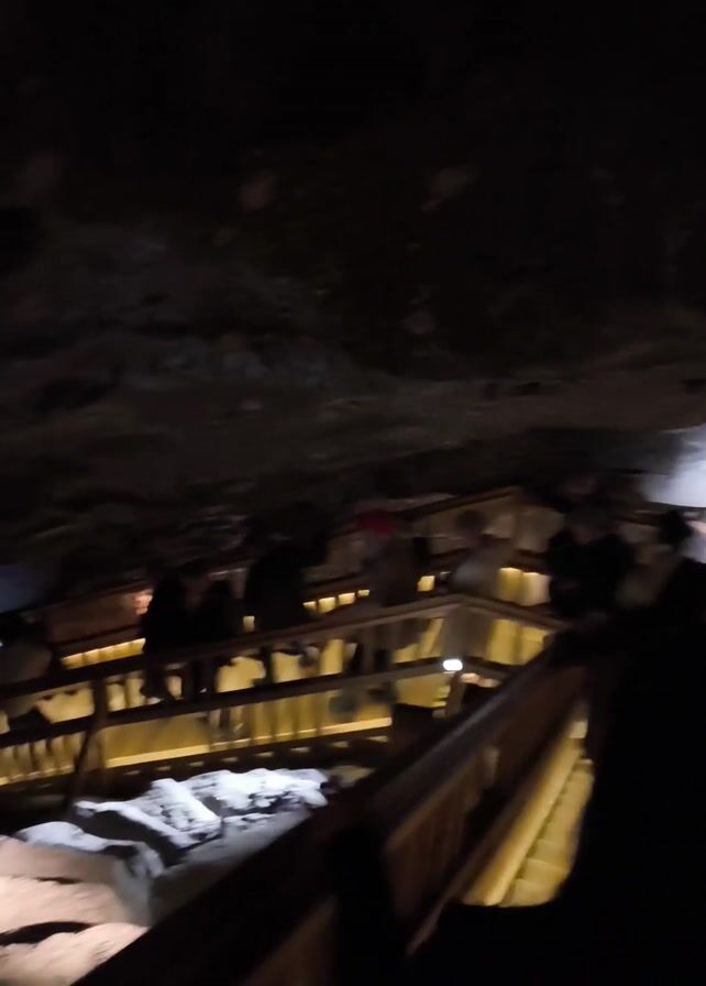 The camera is oriented vertically, looking down into a narrow, dimly lit passageway between rock walls. A wooden staircase with multiple landings descends through the space. People are walking down the stairs. The space is narrow and constrained. The walls appear natural and uneven, suggesting a cave or grotto. Some lighting fixtures are attached to the staircase structure. The camera is unsteady, contributing to a sense of disorientation. The foreground is obscured by a dark object, possibly the person holding the camera.