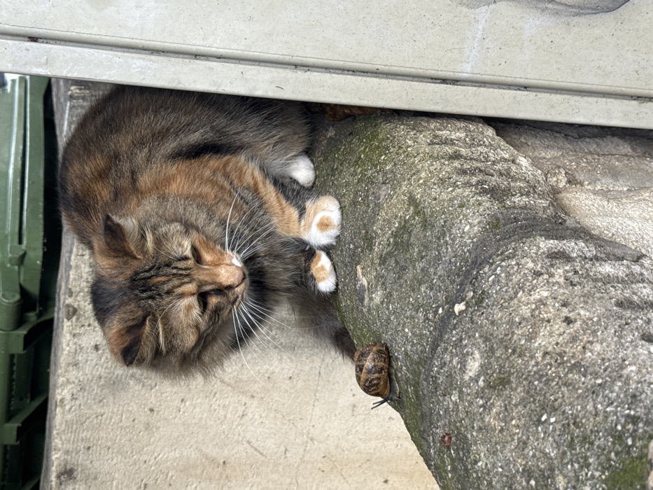 A tortoiseshell cat curls up in a corner with its eyes closed. It is lying on a concrete surface next to a large, mossy stone or pipe. The cat's paws are white and it has long whiskers. A snail crawls up the side of the stone next to the cat's tail. The cat appears relaxed and unconcerned by the snail. A green metal structure is visible on the left side of the frame.