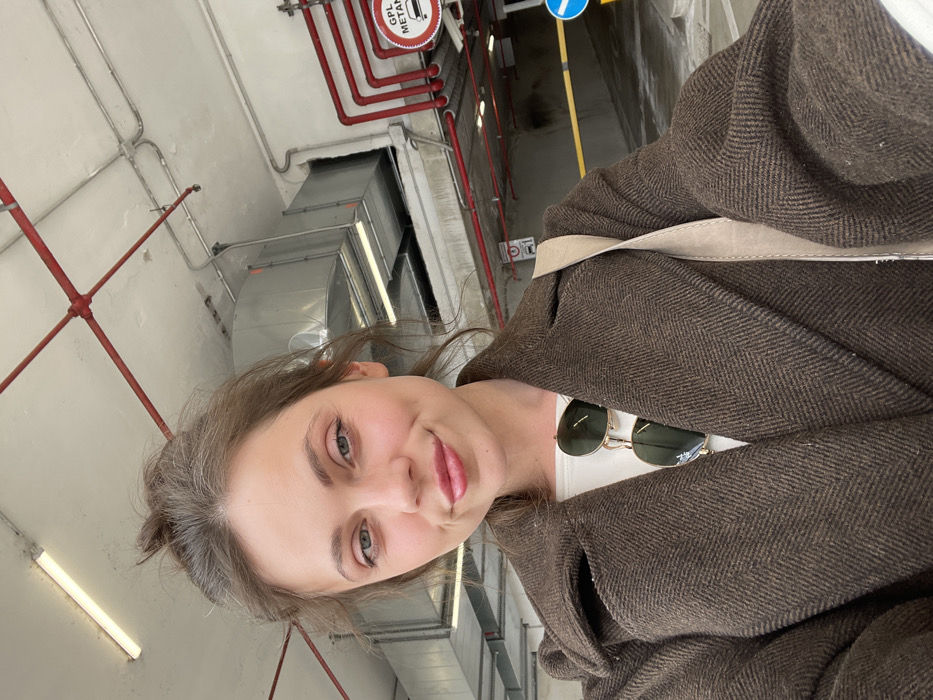 A young adult female is depicted in a close-up, chest-up selfie within an indoor parking garage in Pogerola, Italy