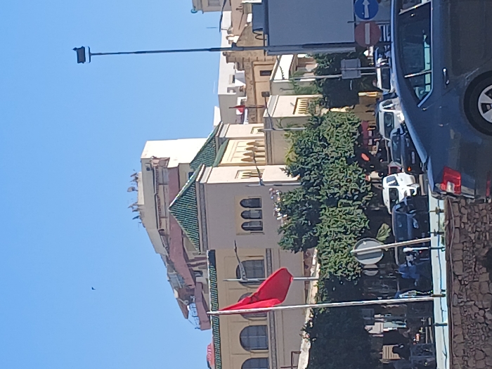 A daytime urban scene in Meknes, Morocco, captured under clear blue skies