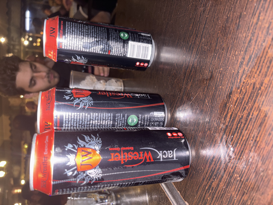 - "The image displays three 500ml "Jack Wrestler Energy Drink" cans standing upright on a dark brown wooden table" by FM-qYIdG3, licensed under CC BY 4.0