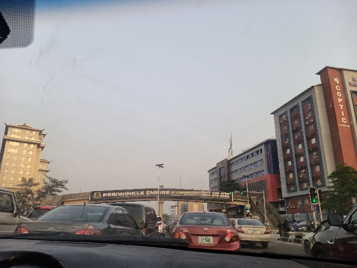 A street view shows several buildings, including one with "Coptic Hospital" vertically printed. A pedestrian bridge with "Periwinkle Empire" written across it spans the road, with traffic stopped below. Various cars are visible, including a red Toyota Corolla with license plate "CA1-56HE." The sky is overcast. The image appears to have been taken from inside a car.