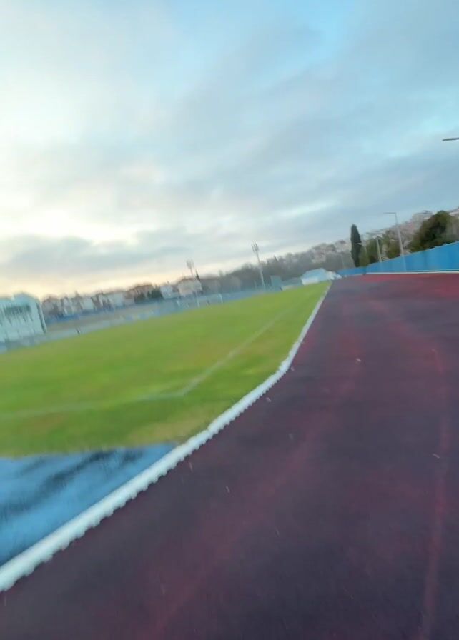 blurred view of a running track and a sports field. The track is red, and the field is green with blue accents. The camera seems to be moving quickly along the track, causing the blurry effect. The sky is visible above, with clouds.