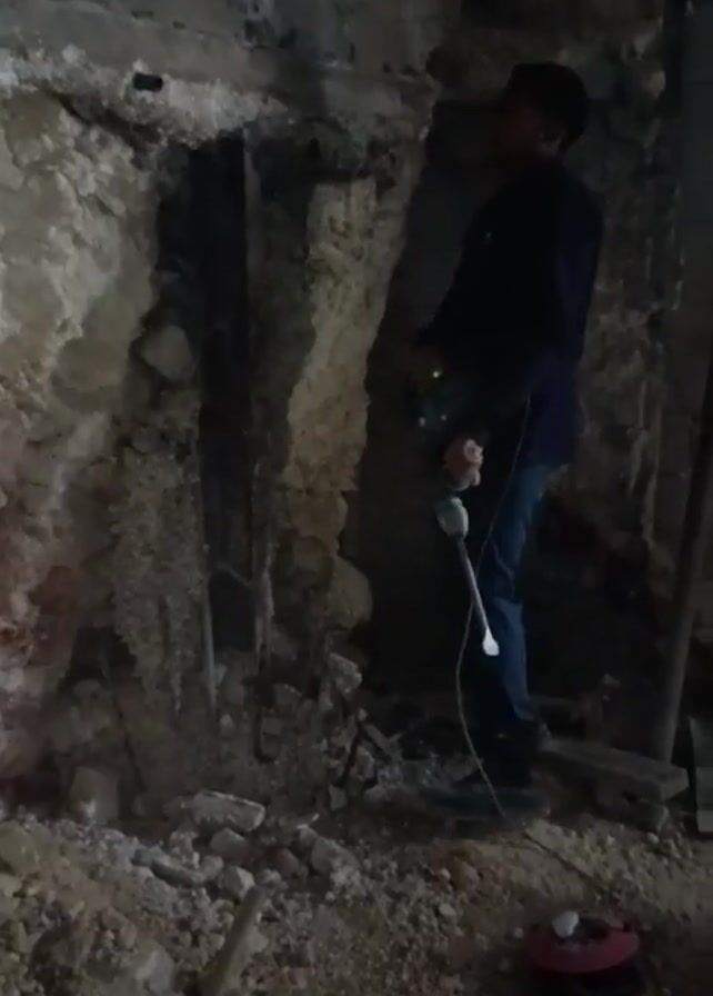 man drilling into a wall. He is wearing a dark shirt, jeans, and a cap. He stands in a room with a rough, uneven floor covered in rocks and debris. The wall he is drilling into is a mix of stone and what appears to be some form of sealant or filler. A white pipe runs along the top of the wall. A red object is seen on the floor near the man. He is using a handheld drill, holding it with both hands to bore into the wall.
