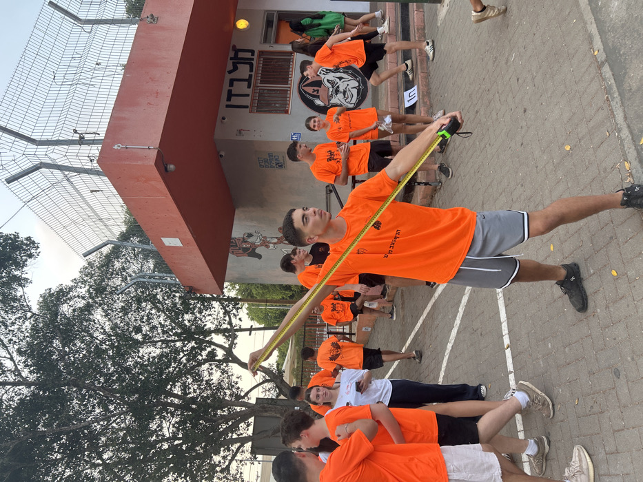 The image displays an outdoor scene at what appears to be a recreational or educational facility in Tel Aviv, Israel. Approximately 15-20 young individuals, primarily teenagers or young adults, are present. Most are wearing identical bright orange short-sleeved t-shirts, some featuring a graphic and Hebrew text. In the immediate foreground, slightly right of center, a male with short dark hair, wearing an orange t-shirt and grey athletic shorts, stands with his arms extended horizontally. He holds a yellow tape measure stretched across his body, with the black casing in his left hand and the tape extended towards his right hand. To the left of the central figure, a group of other individuals in orange t-shirts are standing and conversing. One female in a white t-shirt and dark pants is visible among them, looking at a mobile phone. Other individuals in orange t-shirts are scattered throughout the mid-ground and background, some standing, some appearing to be seated on steps leading to a building. The background features a two-story building constructed with an orange concrete upper section and a light grey lower section. Black Hebrew text reading "מועדון" (Mo'adon - Club) and "אלבדו" is visible on the grey wall, along with a large graphic of a bulldog's head and a universal accessible toilet symbol. A tall, chain-link fence topped with barbed wire runs along the roofline of the building. Large green trees with dense foliage are visible to the left of the building and further in the background. The ground is paved with rectangular grey pavers, marked with white painted lines. The sky is overcast, and the lighting suggests late afternoon or early evening.