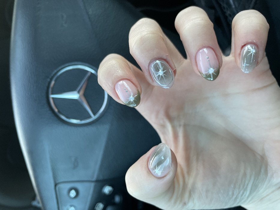 The image displays a close-up of a human left hand positioned in the interior of a vehicle. The hand features medium-length, oval-shaped fingernails with a professional manicure. The thumb and ring finger nails have a clear base with a translucent olive-green or grayish-brown full overlay, each adorned with a white starburst design centered and three small silver studs/gems near the cuticle. The index, middle, and pinky finger nails exhibit a French manicure style, featuring a clear base with an olive-green or grayish-brown crescent tip, each decorated with a white starburst design and two small silver studs/gems on the clear base. The skin of the hand appears light-toned with visible knuckles. The background consists of a dark, multi-functional steering wheel, identifiable as belonging to a Mercedes-Benz vehicle by the prominent chrome three-pointed star logo centered on the airbag cover. Buttons on the left spoke of the steering wheel are partially visible and out of focus. The scene provides no discernible geographical indicators to determine a specific city location.