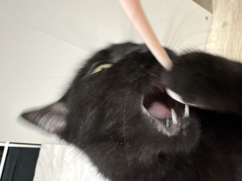 A black cat with yellow-green eyes opens its mouth, revealing its teeth and pink tongue. A pink object touches the cat's face, likely causing its reaction. The cat's fur is short and smooth. The background is a mix of white and light brown tones, possibly a wall or furniture. A blurry grid-like structure appears in the bottom left corner. The photo has a close-up, low-angle perspective.
