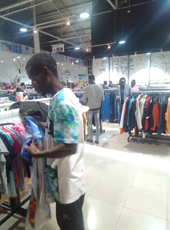 An indoor scene within a large second-hand clothing retail store, likely located in Nairobi, Kenya, possibly within a market area known for *mitumba* (second-hand clothes)