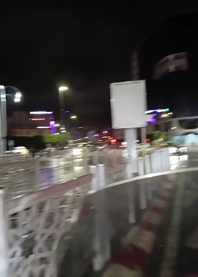The video depicts a night scene in a city, likely after a recent rain, as the pavement is wet and reflects the lights. The camera appears to be moving, giving a blurred effect at the beginning, but stabilizes to show a street scene with buildings, streetlights, and vehicles. There is a decorative metal railing in the foreground with some colorful lights, possibly reflecting from the wet ground. A sign with a blank, illuminated surface is visible. The buildings in the background have lit signs, suggesting commercial or public establishments. Traffic is present, with headlights and taillights of vehicles moving on the road. The general atmosphere is dark but well-lit by the city's infrastructure.